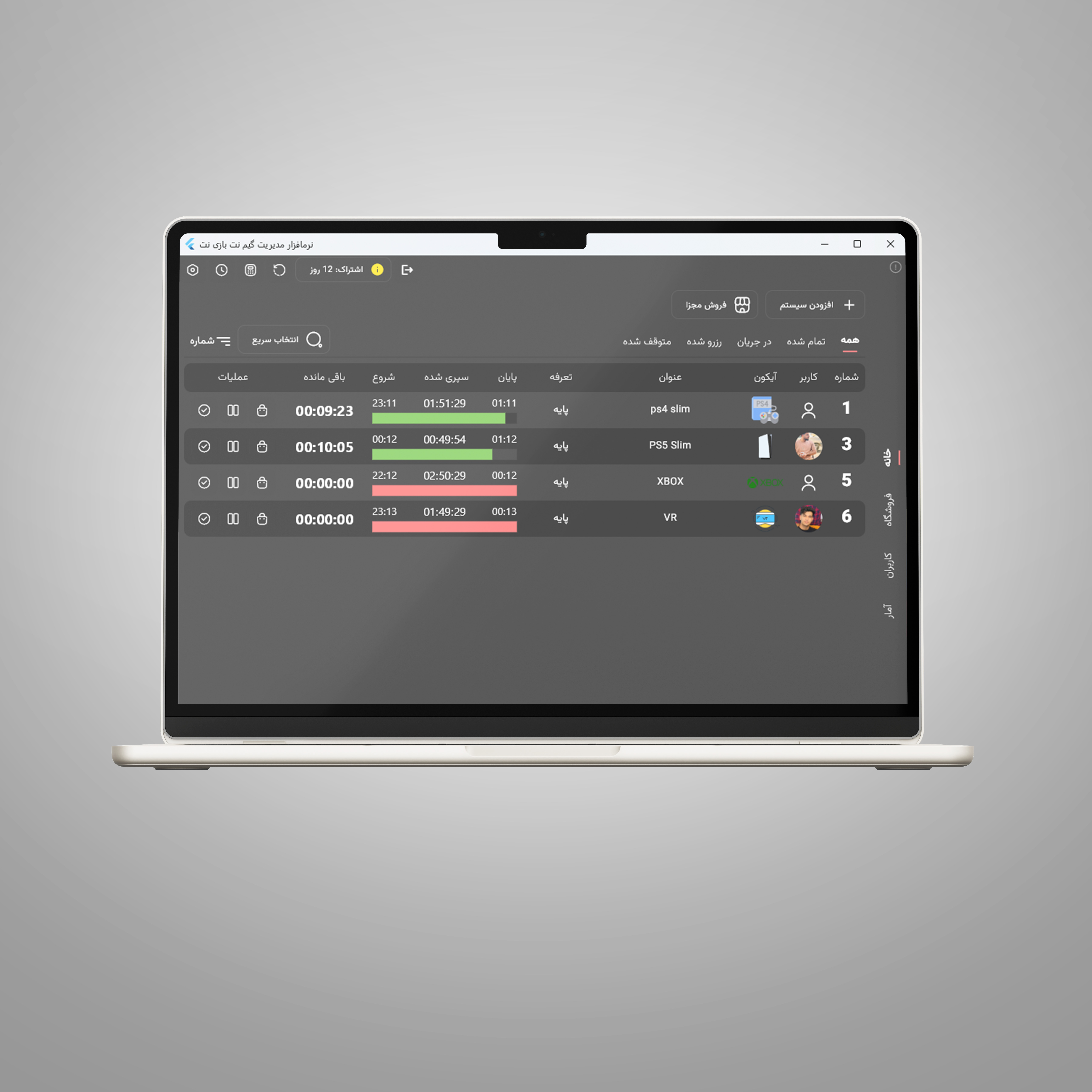 این نرمافزار، ابزاری کامل و حرفهای برای ادارهی گیمنت شماست. با کنترل لحظهای دستگاهها، سیستم حسابداری خودکار، رزرو آنلاین، داشبورد مدیریتی پیشرفته و امکانات متنوع مثل تعرفههای VIP، فروشگاه داخلی و گزارشگیری حرفهای، همه چیز را یکجا و بدون دردسر مدیریت میکنید. رابط کاربری ساده و امنیت بالا هم خیال شما را از عملکرد مطمئن نرمافزار راحت میکند.